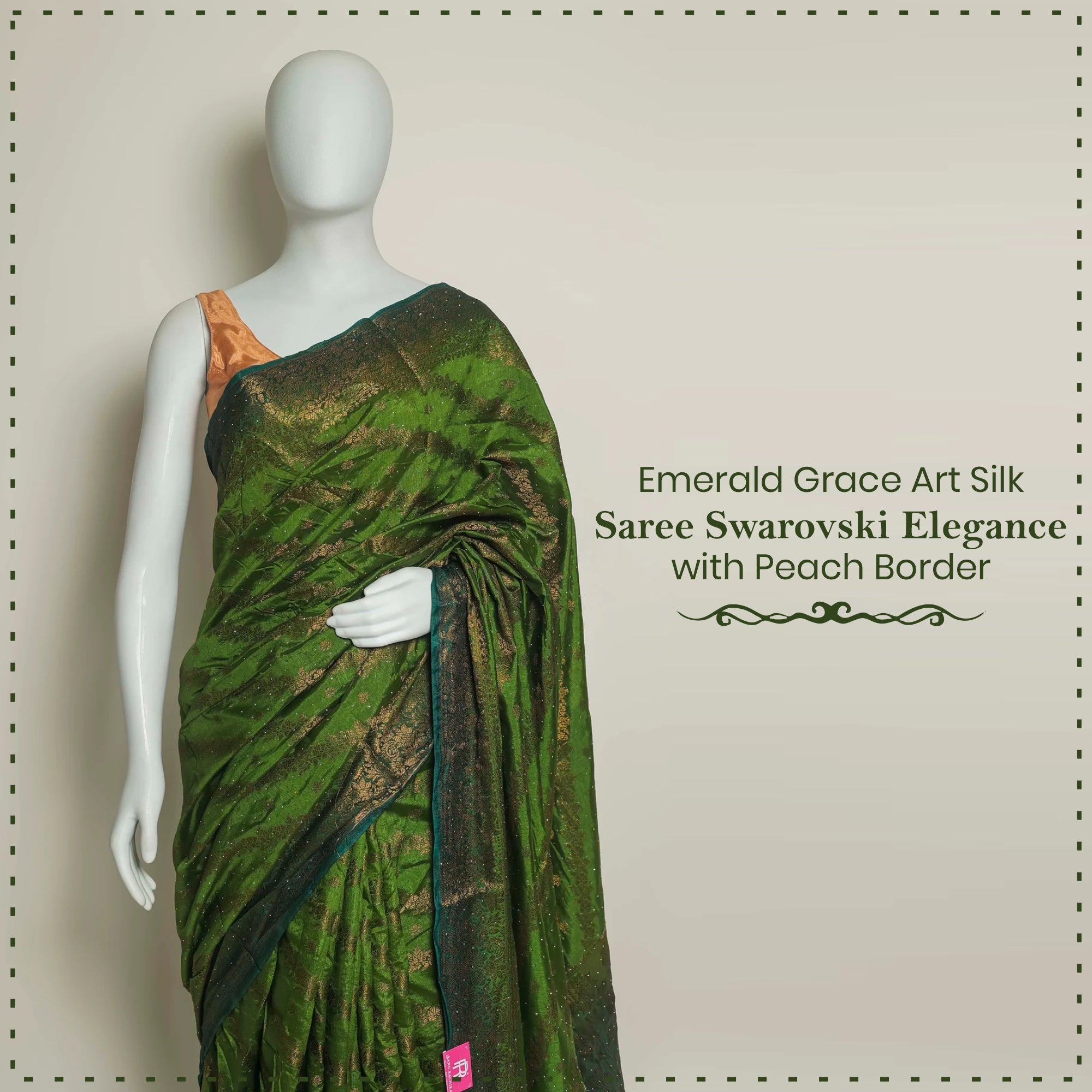 Emerald Grace Art Silk Saree – Swarovski Elegance with Peach Border