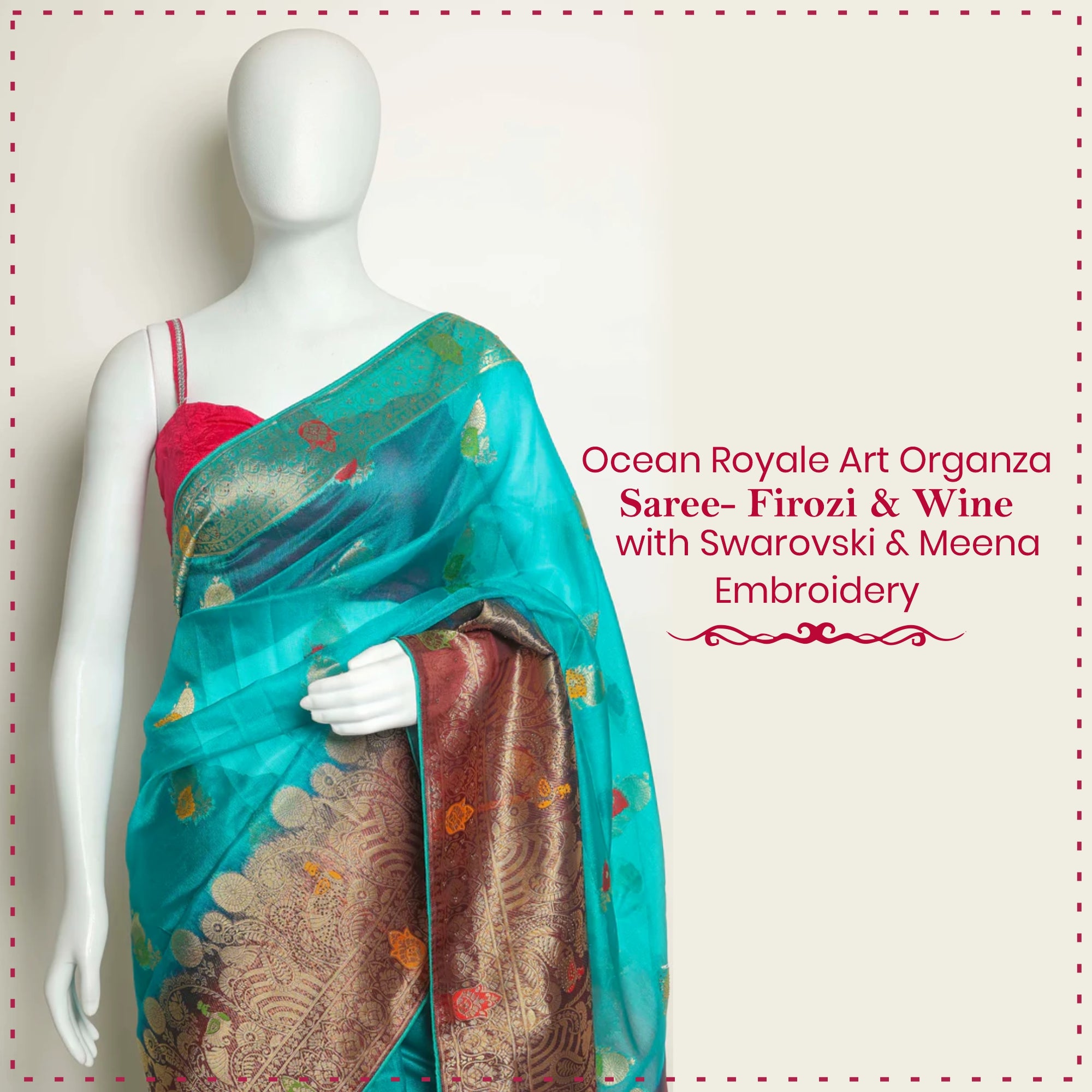 Ocean Royale Art Organza Saree – Firozi & Wine with Swarovski & Meena Embroidery
