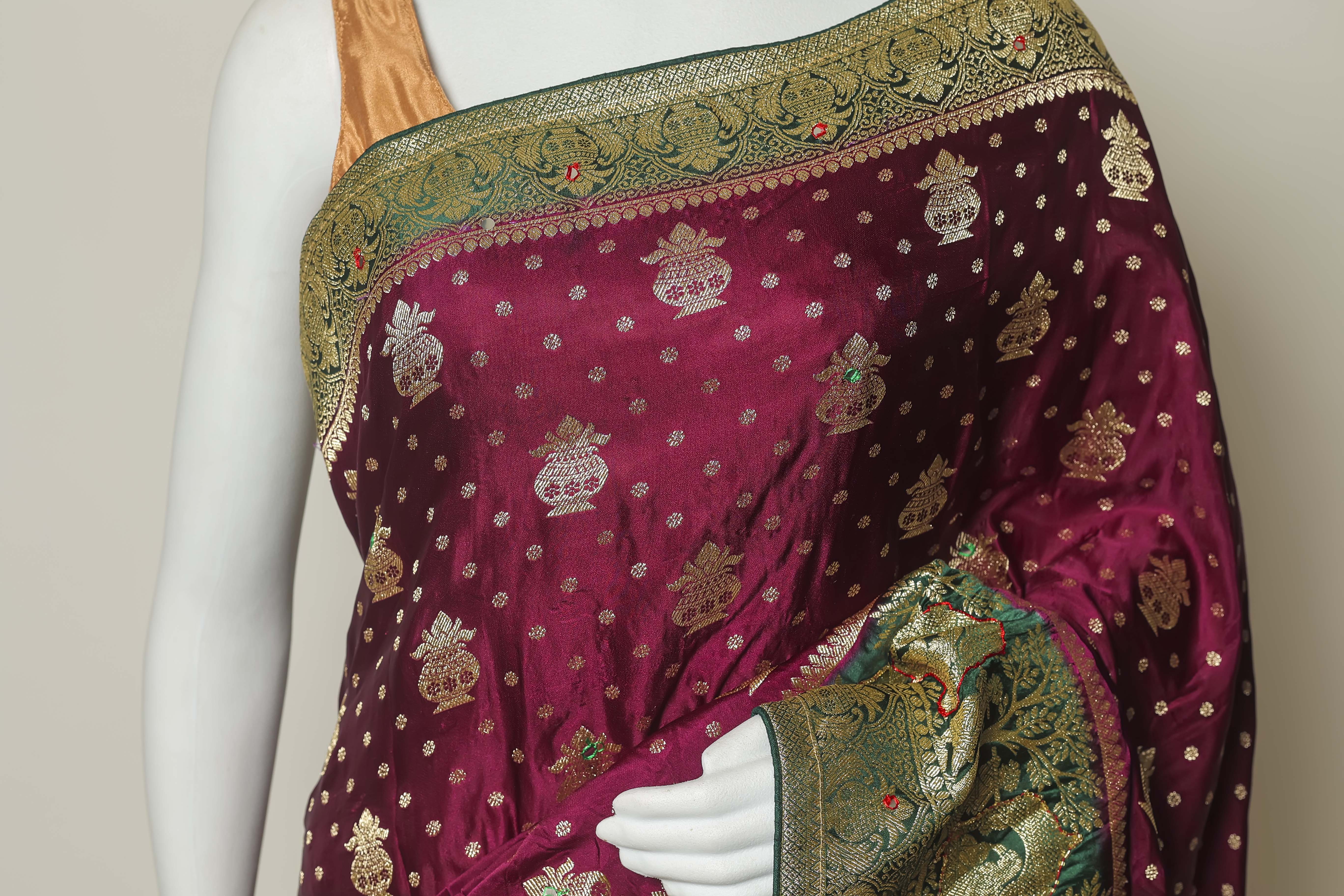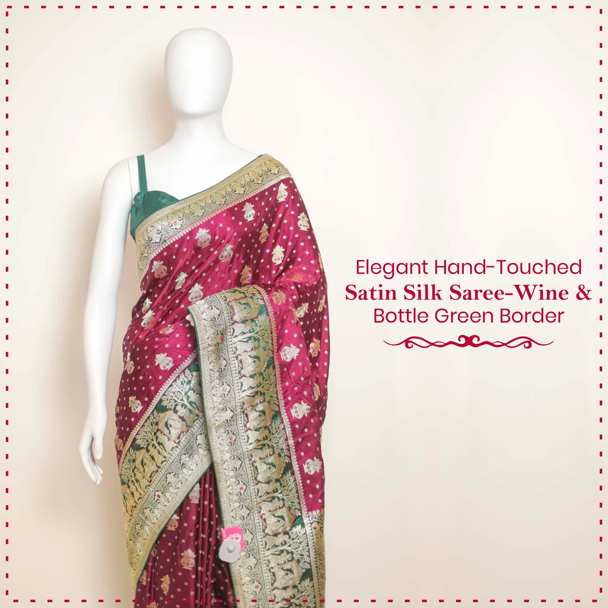 Elegant Hand-Touched Satin Silk Saree – Wine & Bottle Green Border