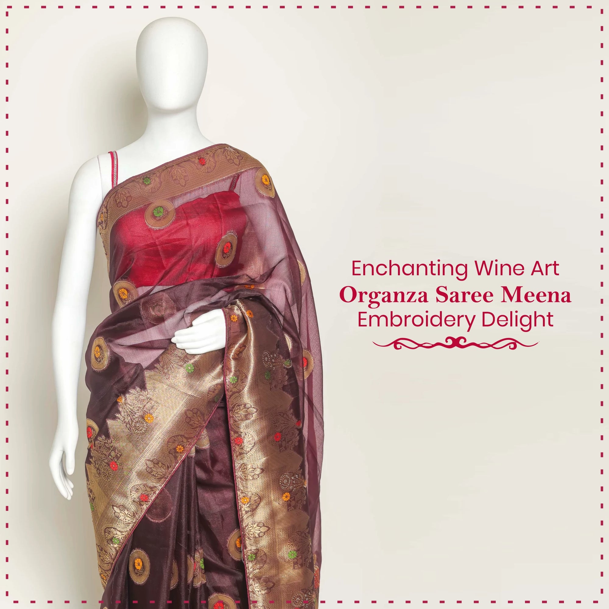 Enchanting Wine Art Organza Saree – Meena Embroidery Delight
