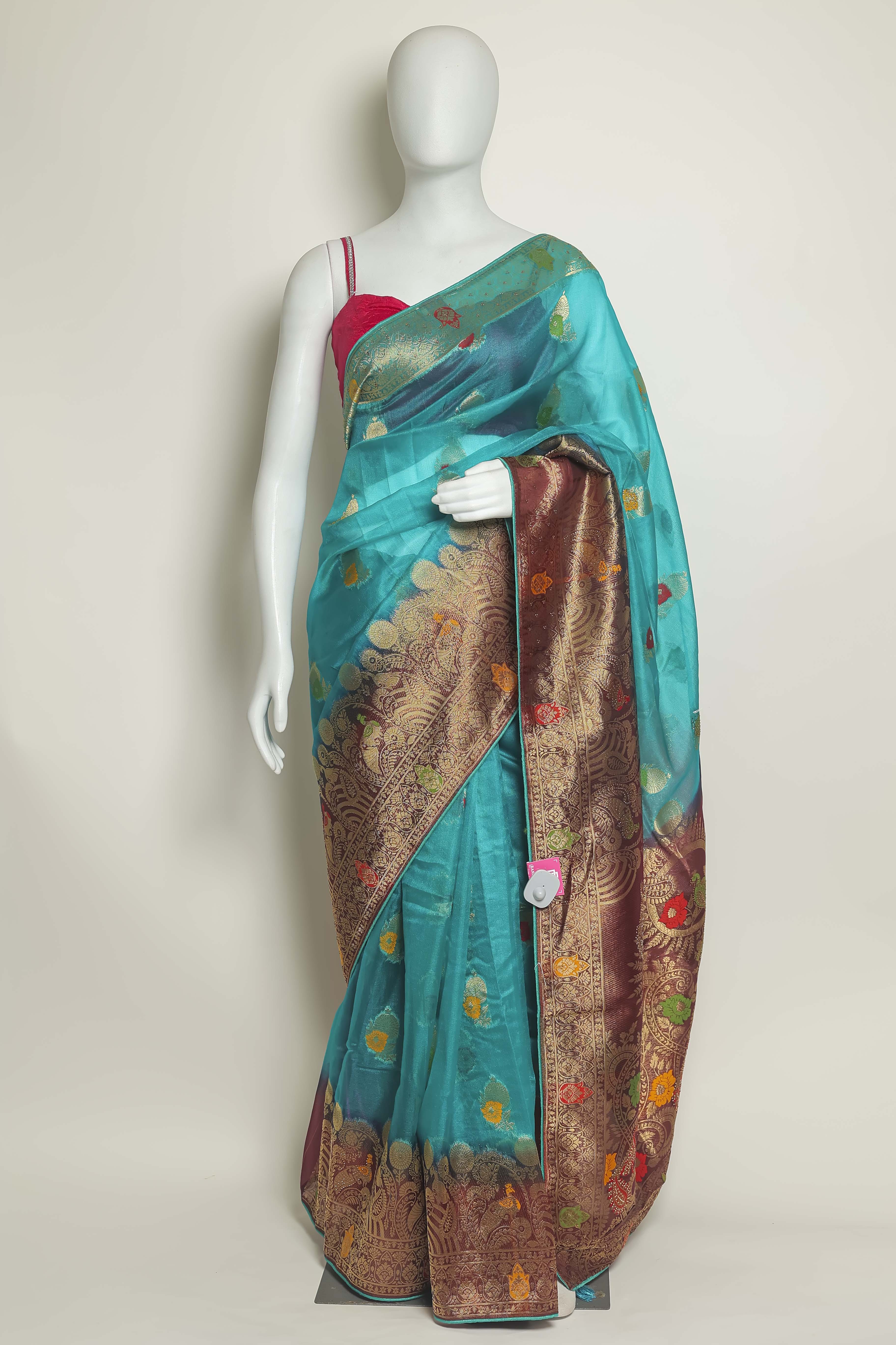 Ocean Royale Art Organza Saree – Firozi & Wine with Swarovski & Meena Embroidery - Blue